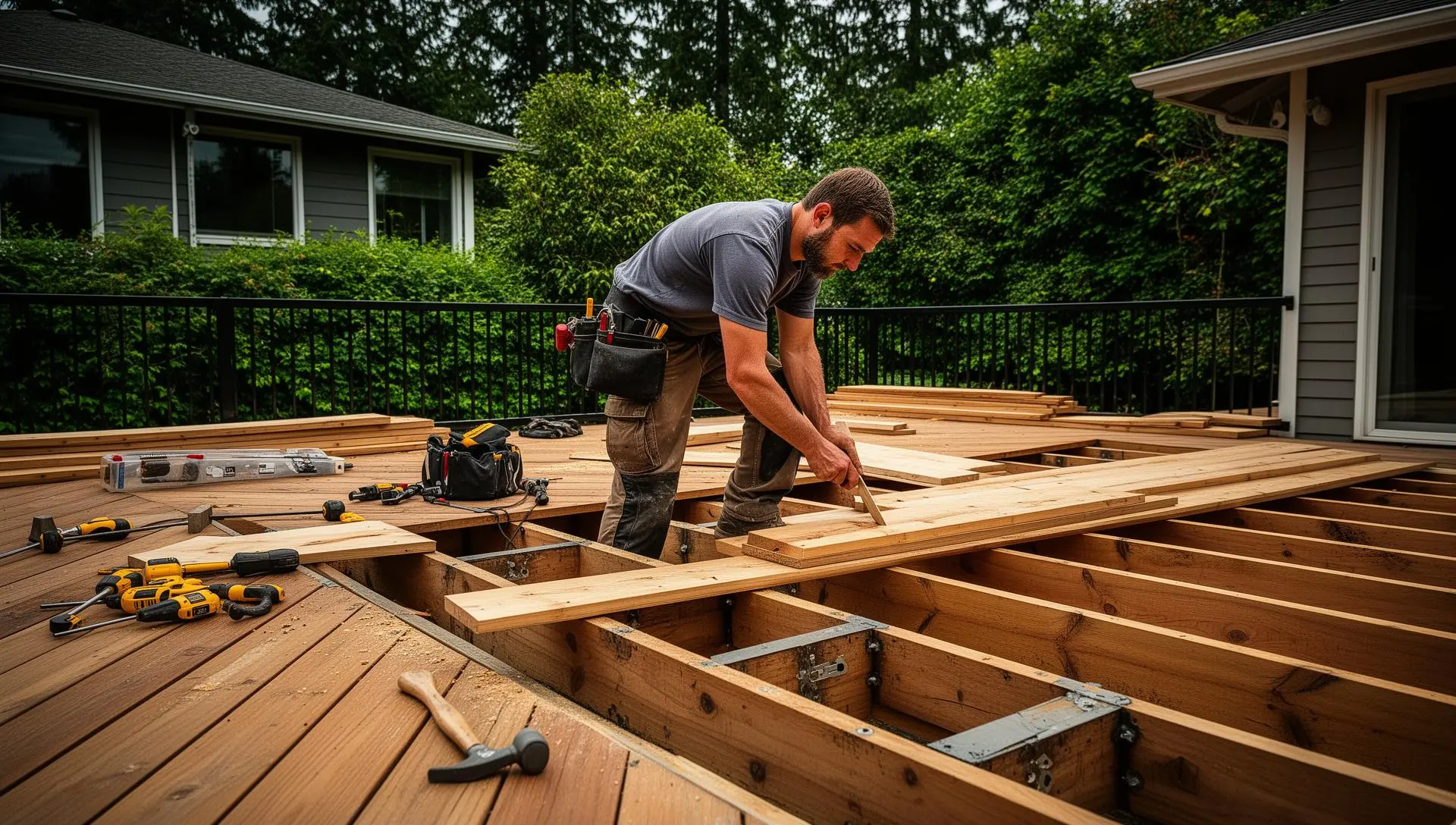 We assess the full scope and recommend the most cost-effective approach. Sometimes targeted board and joist replacement is sufficient; other times a rebuild makes more sense.